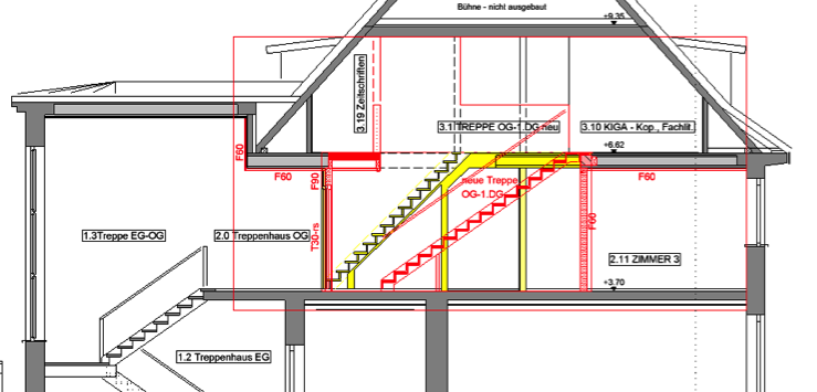 Der 2. Planungs- und Bauabschnitt beinhaltete weitere Brandschutzertüchtigungen, die Komplettsanierung aller Sanitärräume in OG und DG, die Instandsetzung und Modernisierung der kompletten Haustechnikinstallationen, Ausbau des DG in eine Verwaltungseinheit für den KiGa inkl. Einbau einer neuen, flacheren Treppe.