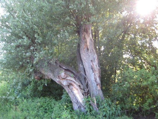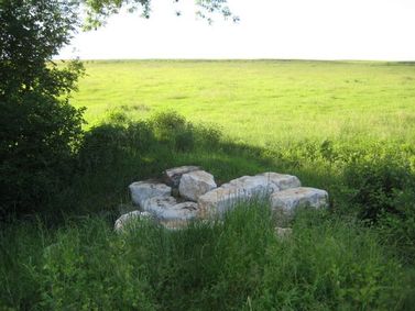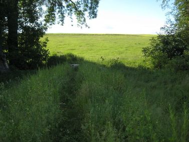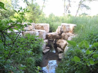 Links und rechts der großen Natursteine schließt ein Damm, der rein aus bindigem Erdmaterial erstellt wurde und nicht sehr hoch ist. Dahinter ist eine Retentionsfläche entstanden, in die Hochwasser sich verteilen kann, bevor es verzögert und langsam abfließt.