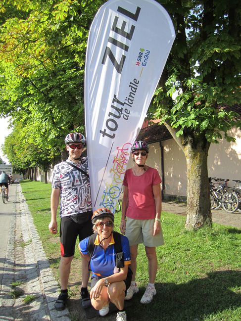 Auch hier wieder Volksfeststimmung, Kaffee und Kuchen, super Bewirtung. Ab Oberelchingen ging es (fast) nur noch bergab nach Ulm, die Donau entlang und schließlich über die Donau zum Kloster Ulm-Wiblingen, dem Tagesziel nach 75 km oder 75 € für jede/n der drei "Strampler", bzw. für den Förderverein der Grundschule auf Mauern. Im Klosterhof ein kühles Bier, Live-Musik und ausgelassene Stimmung und vor den Klostermauern das Zielfoto.
