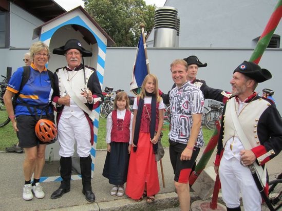 Die Tour führte das Filstal aufwärts, mit Zwischenhalt in der historischen Arbeitersiedlung in Kuchen über Geislingen nach Eybach. Anschließend über die (Schweiß treibende) Waldhausener Steige 4 km lang auf die Albhochfläche, wo es in Neenstetten eine Mittagsrast bzw. -essen gab. Die Bewirtung war super, Live-Musik, Volkstanzaufführungen und jede Menge guter Stimmung. Nach einer guten Stunde kurz vor 14 Uhr wieder auf die Räder. Auf der Albhochfläche ging´s immer wieder zu Sache, jeder rasanten Talfahrt folgte ein oft steiler Anstieg. Aber immer wieder wurden die Radler angefeuert durch "Empfangs-Kommittees" in jedem Dorf, die viel Fantasie und Kreativität an den Tag gelegt hatten und die Stimmung befeuerten. Die Strapazen wurden dann mit einer Rast in Oberelchingen belohnt, wo man sich bereits im Bayrischen befand.